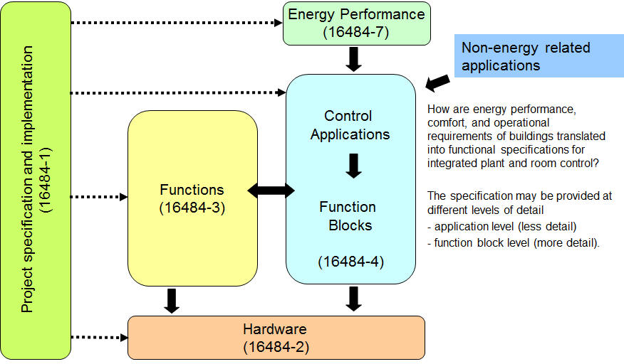 規格の全体構造は当初は明確に示されないままに、BACnet以外の課題の幹事団体であるCEN内部の進行状態や緊急度に基づいて構想され、規格化されていく中で、徐々に全体構造が明確化し、時にはPartの入れ替えも行われ、2015年段階で整理された、各Partの役割と関連とが下図のように明確になり、締めくくりとなるPart7とPart4の規格化に向けての最終努力が行われている。この二つ、、特にPart-7が長引いているのは、それが省エネルギーとの関係を定義するもので在るので、EUの省エネルギー政策(EPBD)の改正の状況を羽根井しているからである。 |