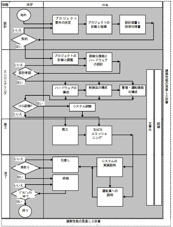 Part1で規格化された「プロジェクトの仕様と実装」において定義されたもの。建築設備としてのbACS仕様の設計はビル設備設計社の役割である。論議の過程でこの設計がBACS(或いはBEMS)メーカーの設計プロセスと誤解される雰囲気があったので、この点が明確になるようにした。同様にコミッショニングも、BACS実装のコミッショニングと、プロジェクト進行の全体に関わる、計画段階から始まるコミッショニングプロセスと混同しないように、前者はBACSメーカーのエンジニアリングと施工の段階に限定するとともに、後者の意味のコミッショニングが「建築性能の見直しと改善」という記述で生産から運転に至るライフサイクルコミッショニングプロセスの視点と役割が別に在ることが明らかになるように、数のように構造化された。 |
